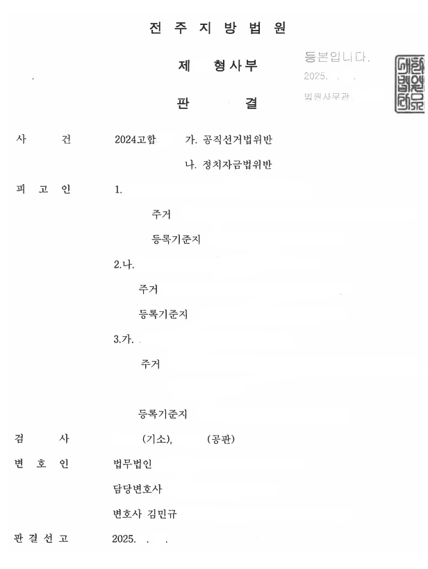 김민규 변호사의 이러한 적극적인 조력으로 인해 법원은 피고인이 재산상 이익을 얻기는 하였으나, 이는 경로당 회원들의 항의에 따른 위자료 명목으로 지급된 것일 뿐 선거 이용 목적이 있었다고 보기 어렵다.”는 점을 고려하여 무죄를 선고하였습니다.