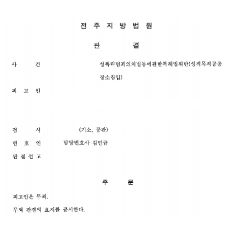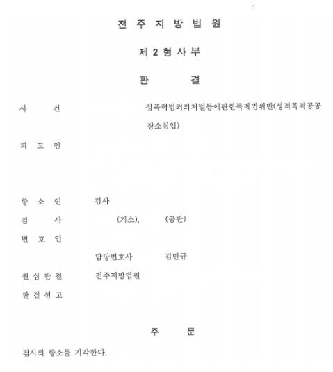 이에 김민규 변호사는, 의뢰인의 시력이 매우 좋지 않다는 점, 생전 처음 헬스장을 이용한다는 점 등을 적극 주장하여 의뢰인에게 성적 목적이 없었으며, 여자 탈의실에 들어간 것은 착오로 인한 것이라는 점을 적극 주장하였습니다.