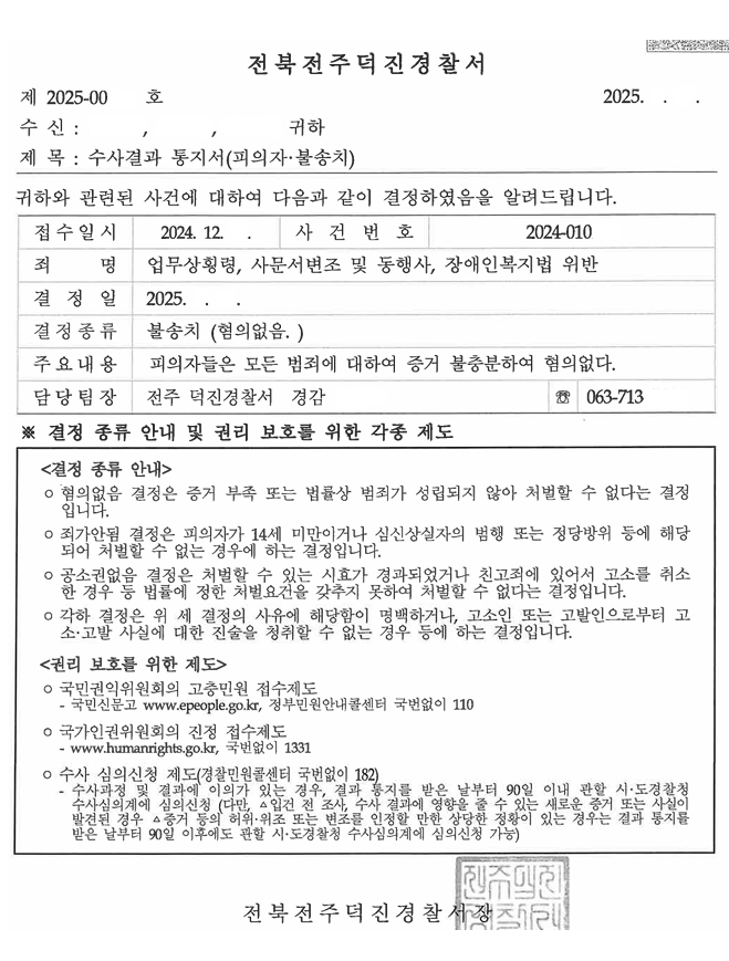 형사 수사기관 불송치받은 사안(업무상횡령, 사문서변조 및 동행사, 장애인복지법 위반)
